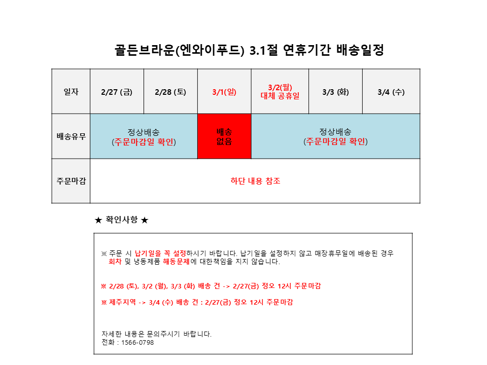 ※ 2/28 (토), 3/2 (월), 3/3 (화) 배송 건 -> 2/27(금) 정오 12시 주문마감