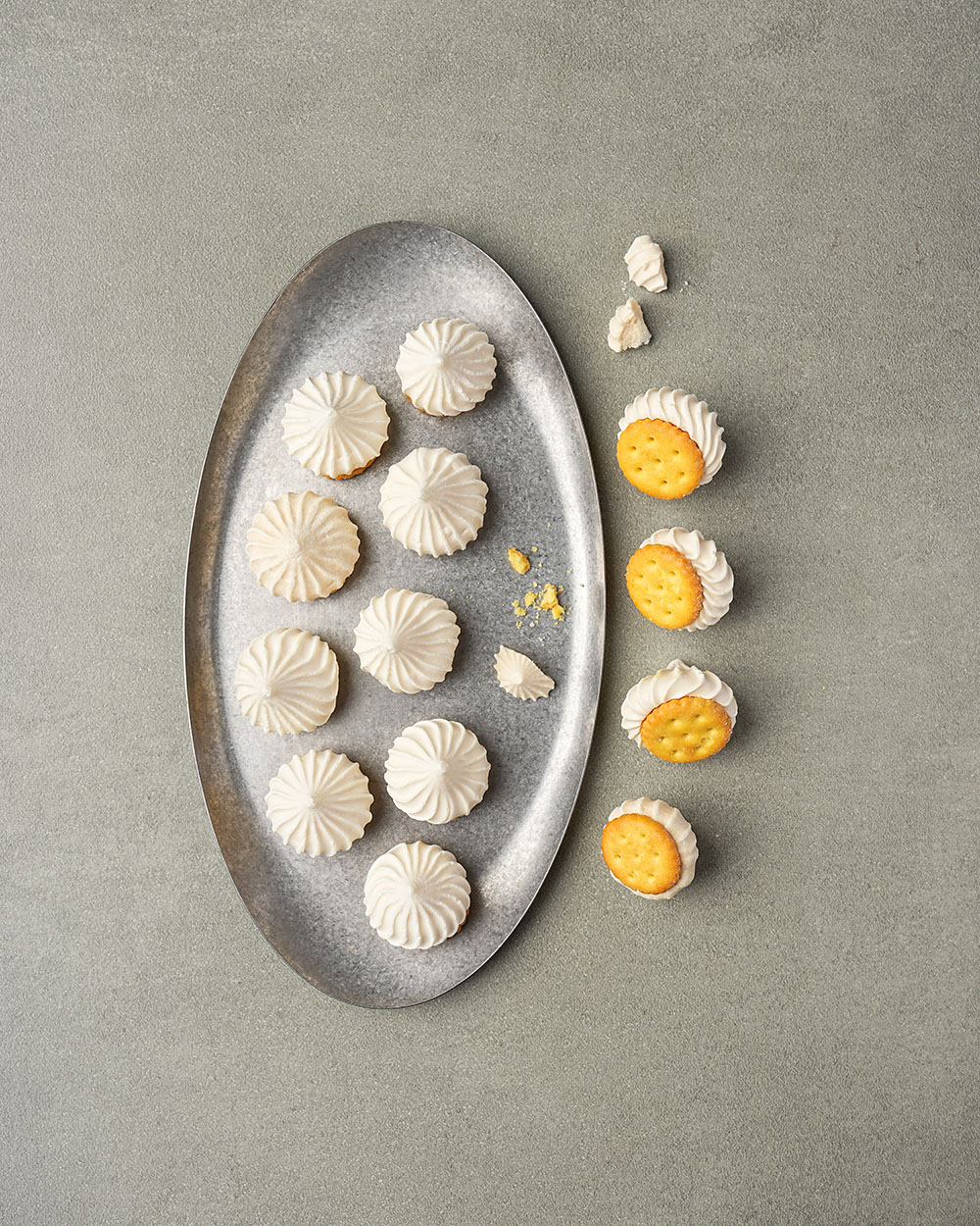 바삭한 치즈 크래커 위에 머랭을 올려, 가볍지만 중독적인 단짠 식감을 완성한 [크래커 머랭쿠키]를 소개해 드립니다.