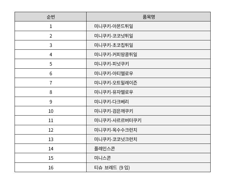 • 본 단가 조정은 미니쿠키 15종과 티슈브레드(9입) 에 한하여 적용됩니다.