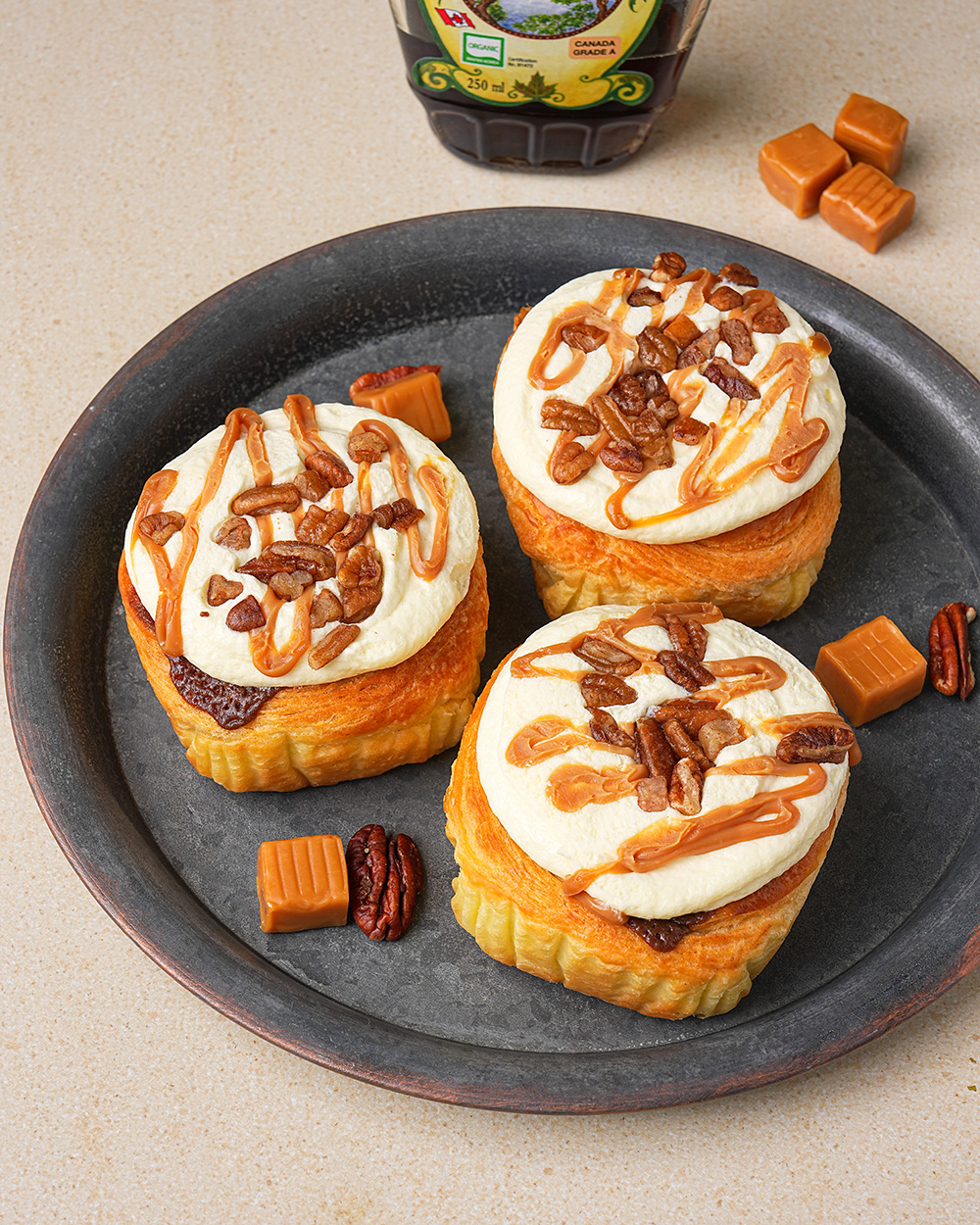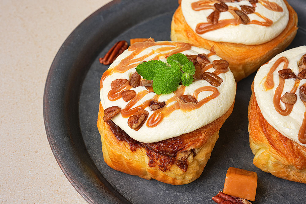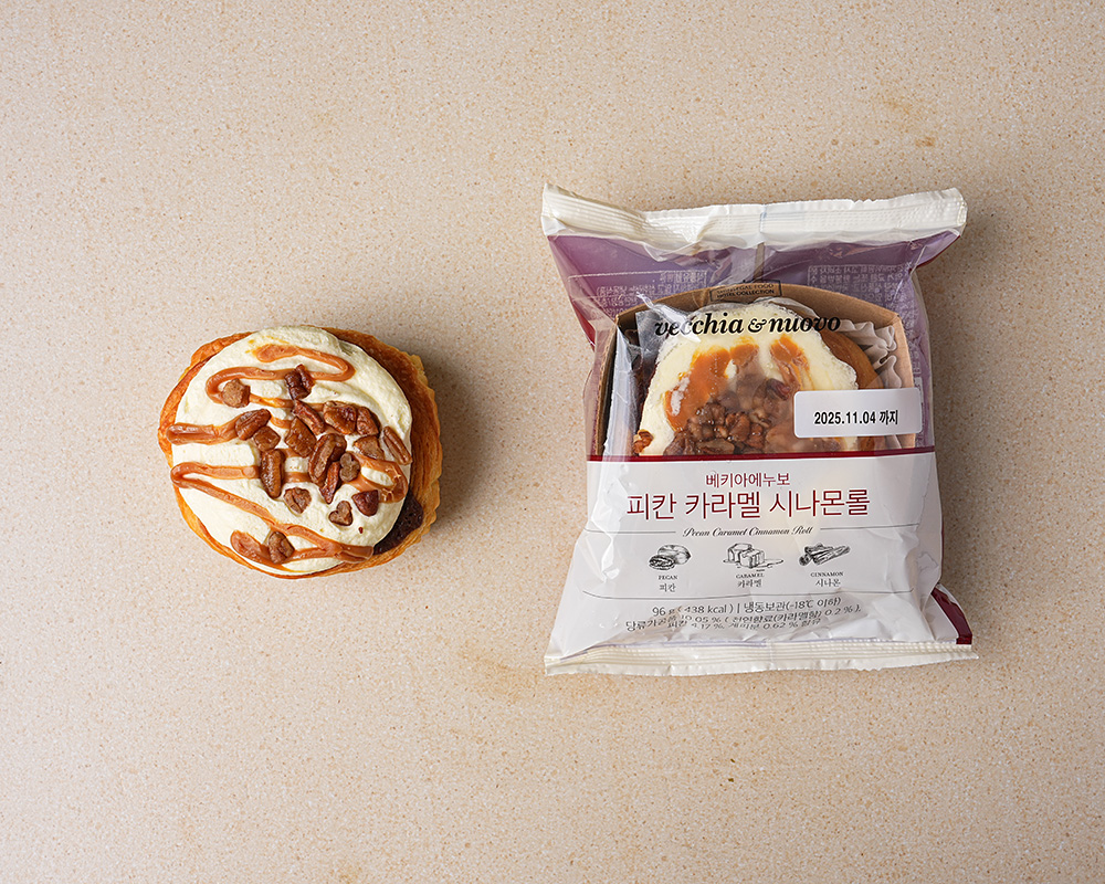 고소한 피칸과 진한 카라멜 소스를 듬뿍 올린 클래식 스타일의 '베키아에누보 피칸 카라멜 시나몬롤'을 소개해 드립니다. 부드럽고 촉촉한 시나몬 번 위에 달콤한 카라멜 글레이즈를 입히고 바삭하게 볶아낸 피칸을 듬뿍 더해 풍부한 식감과 깊은 풍미를 즐길 수 있습니다.